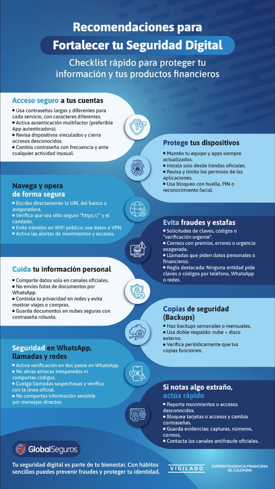 Recomendaciones para fortalecer tu seguridad digital. Checklist rápido para proteger tu información.